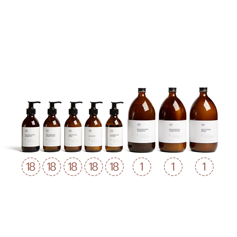 Take your brand to the next level with an expanded inventory and greater savings. Eighteen of each retail product, and one of each professional care product, branded with your personalised labels.